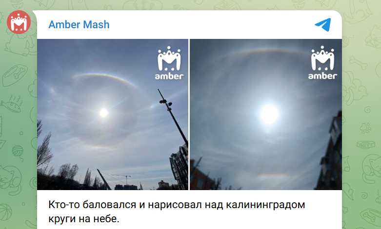 В понедельник днём жители областного центра заметили в небе нечто необычное. Над Калининградом появился светящийся белый круг, который опоясывал небо параллельно земле. Фотографиями редкого явления поделился Telegram-канал Amber Mash