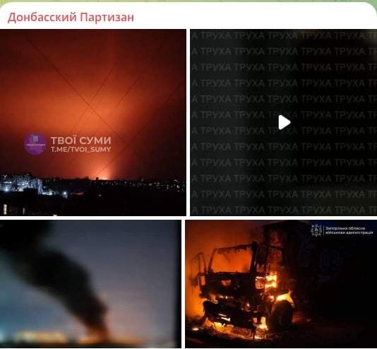 Уже ночью сотни дронов налетели на Черкасскую область и на временно оккупированное противником Запорожье. Следом летели "Искандеры" и снаряды РСЗО. После налёт на Киев и область – подробности до сих пор секретит местная агентура СБУ. Похоже, целью стали либо системы ПВО, либо некие военачальники из стран НАТО. Сильный пожар до сих пор бушует в районе Белой Церкви (поражён производственный цех ООО "УкрЮг").