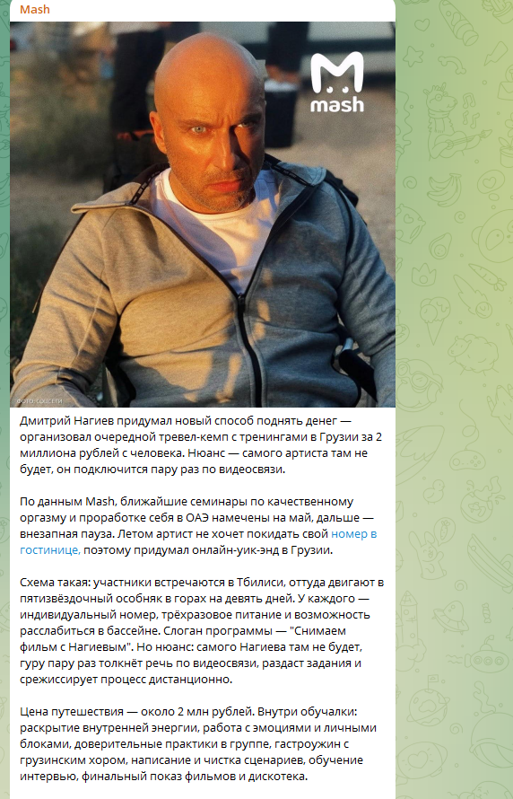 Но есть нюанс. Сам Нагиев в Грузию не собирается. Он будет "тренировать" клиентов по видеосвязи. А те за то, что "гуру" в Грузию не поедет, заплатят по 2 млн рублей (именно столько стоит билет).